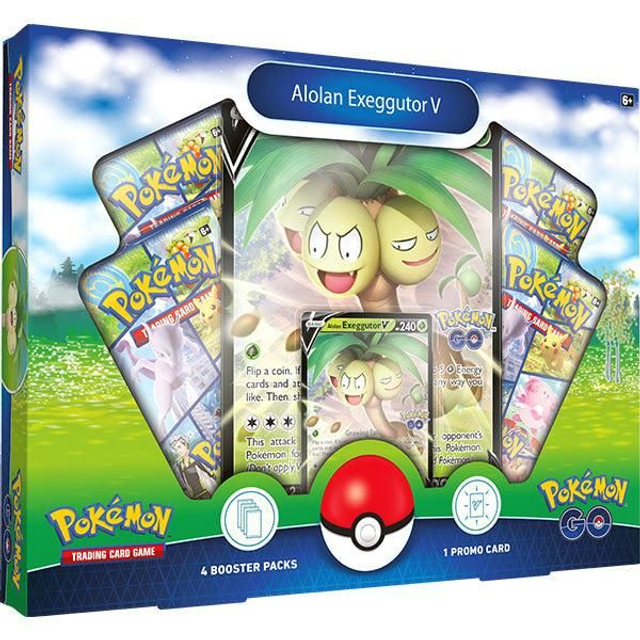 Growing taller and stronger in the tropical sunshine, Alolan Exeggutor V surveys its surroundings and then swings in to strike! This powerful Grass-type Pokémon makes it easy to get Energy into play so you can land a big hit. Here you’ll find a ready-to-play copy of Alolan Exeggutor V, plus an oversize version to show off in your collection, as well as a handful of booster packs from the special Pokémon GO expansion.